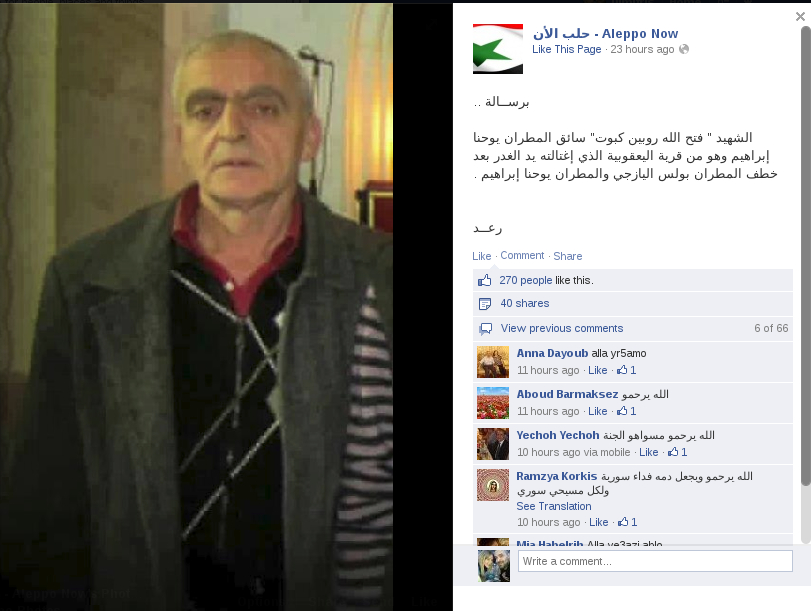 - Την φωτογραφία (άνω) που απεικονίζει ζωντανό τον άτυχο οδηγό, έστειλε αναγνώστης του iefimerida.gr επικαλούμενος ανάρτηση στο facebook από το μέσο κοινωνική δικτύωσης «Aleppo Now», σύμφωνα με το οποίο ο άτυχος οδηγός ονομάζεται Fathalla Robben Kabbout.