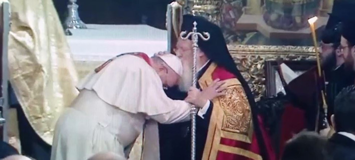 Mετά το πέρας των προσφωνήσεων ο πάπας Φραγκίσκος κατευθύνθηκε προς τον Οικουμενικό Πατριάρχη, όπου σκύβει το κεφάλι του μπροστά στον Προκαθήμενο της Ορθοδοξίας και εκείνος τον φιλά στο κεφάλι."!