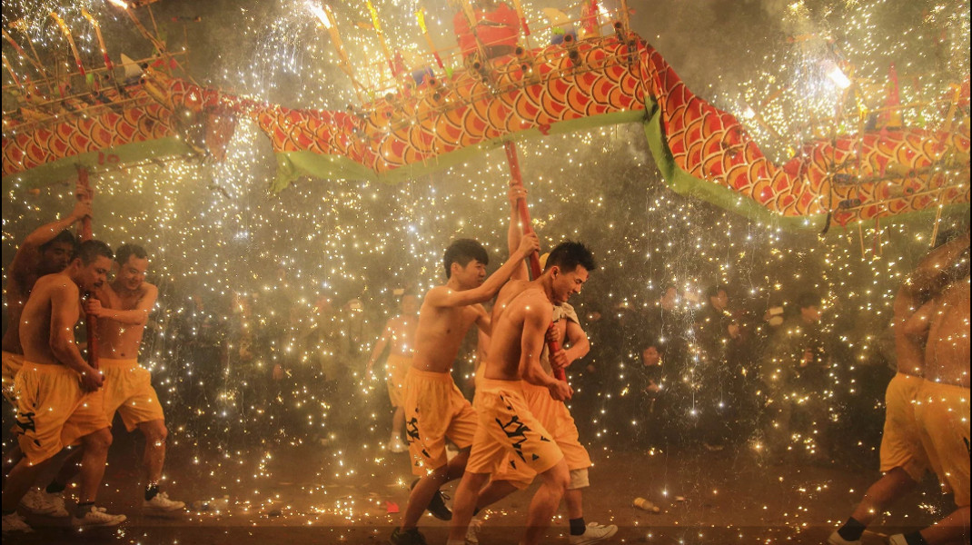 Ο χορός του Δράκου κάτω από βροχή πυροτεχνημάτων