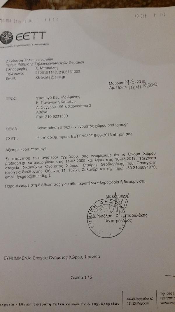 Ο υπουργός Αμυνας σε tweet πριν από λίγη ώρα παρουσιάζει έγγραφο της Εθνικής Επιτροπής Τηλεπικοινωνιών και Ταχυδρομείων, που αποδεικνύει ότι το protagon.gr ανήκει στον πρόεδρο του Ποταμιού.Να και το .....έγγραφο , κυρ Σταύρο....