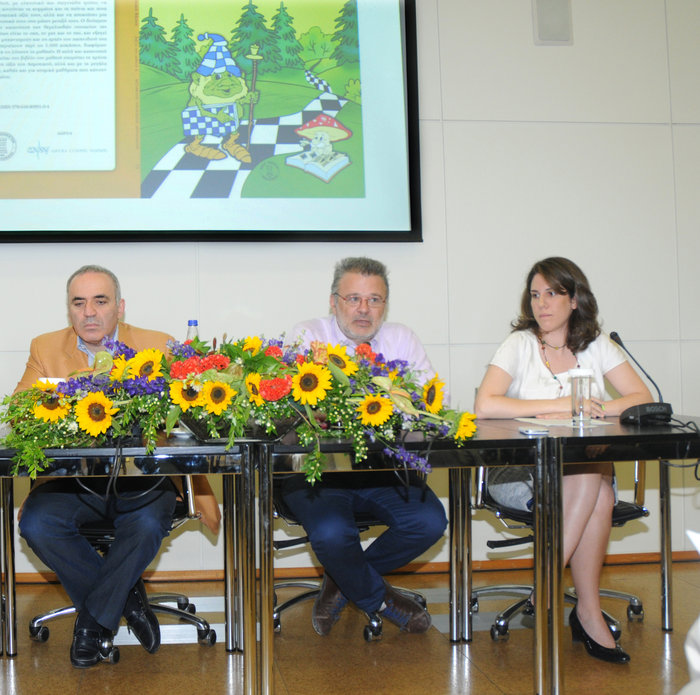 | Από αριστερά: Γκάρι Κασπάροφ,Γιάννης Αντωνιάδης (Πρόεδρος της Ένωσης Σκακιστών Θεσσαλονίκη), Εύα Πολυζωγοπούλου (Συντονίστρια Δωρεών Παιδείας, ΙΣΝ) |